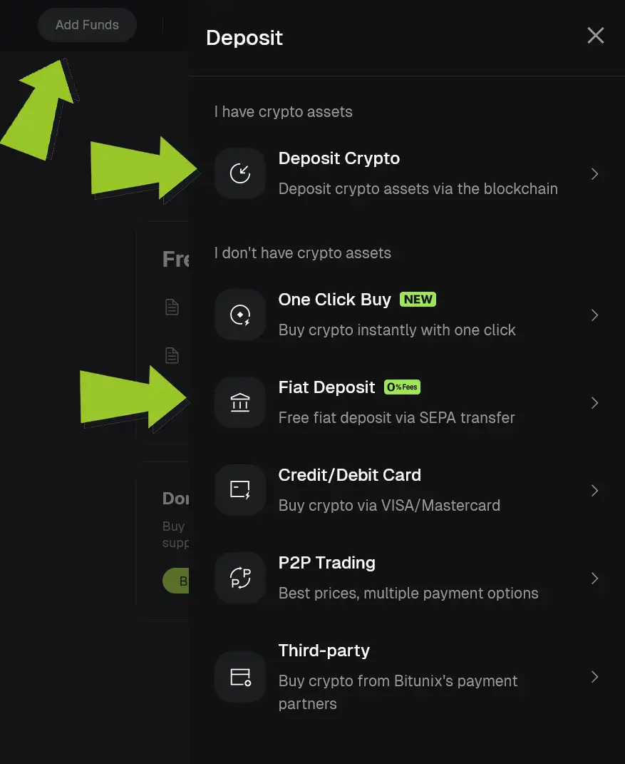 Start your journey by making your first deposit. If you deposit $100 or more, you’ll receive $5 cashback. Click “Add Funds” and choose how you want to make your first deposit: crypto, fiat, or debit/credit card.